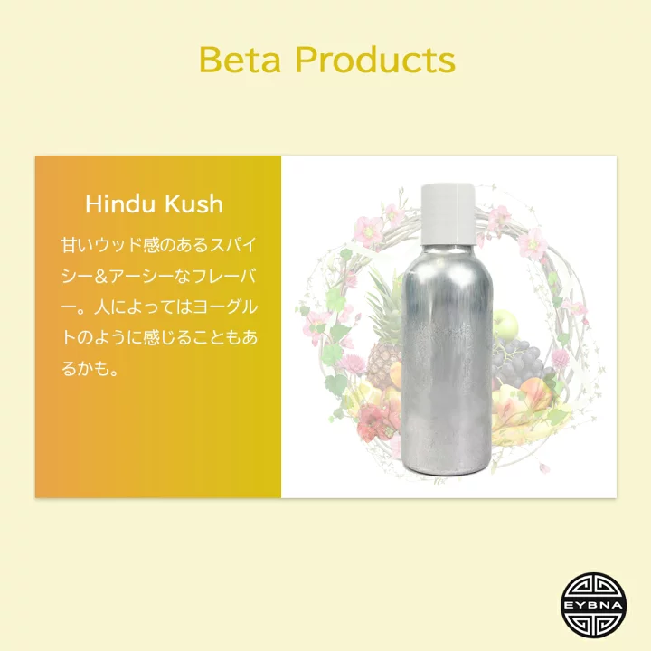 EYBNA 『Pure Terpenesシリーズ -Blueberry-』 EYBNA 『Betaシリーズ -Hindu Kush-』 (eybna18) 商品名 EYBNA Beta Products -Hindu Kush- Beta Productsとは? 契約代理店専売品であり、イブナ社が開発する新製品の先行販売です。代理店とその取引先のみに取り扱いが許されており、予め生産量が限定されています。この”ベータ”で好評だったものが後にレギュラーラインに追加されます。 商品内容 甘いウッド感のあるスパイシー&アーシーなフレーバー。人によってはヨーグルトのように感じることもあるかも。 製造元 EYBNA(カリフォルニア産) 1ml 在庫状態 : 在庫有り ¥3,000(税込) 数量 5ml 在庫状態 : 在庫有り ¥14,000(税込) 数量 10ml 在庫状態 : 在庫有り ¥25,000(税込) 数量 50ml 在庫状態 : 在庫有り ¥115,000(税込) 数量